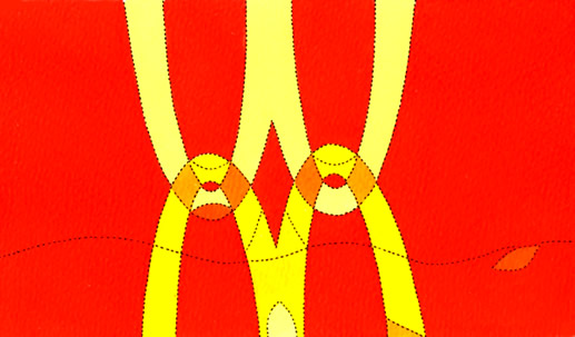 An einer Chiffre des Konsums die Wiederholung zu thematisieren, ist seine Idee, die sich in diesen ornamenthaften Zeichen ebenso Bahn bricht wie in seinen 66 „Sonntagsbildern“ an der Galeriewand. Das Schwunghafte des M ist herangezoomt und ins Zentrum der aquarellierten Blätter gerückt, die bislang eine Auflage von über 800 Stück erreicht haben. Eine witzige und hintergründige Geschichte, die vielfältig interpretierbar scheint und dabei auch den Bogen schlägt zu den Werken von Eric Lanz.